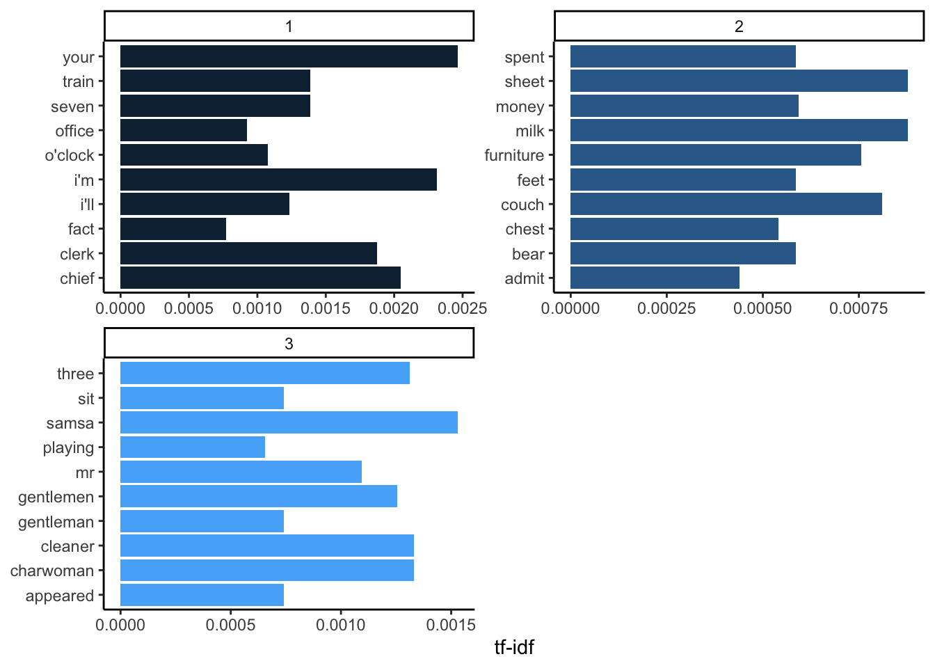 Looking at the words with the highest TF-IDF scores in each chapter, we can see which words are more important to individual chapters. Gregor Samsa is one of the main characters in this novel. The term “Gregor” occurred too frequently throughout the entire book. However, his last name, “Samsa,” was probably not used as often since we can see it has the highest TF-IDF score for chapter 3.
