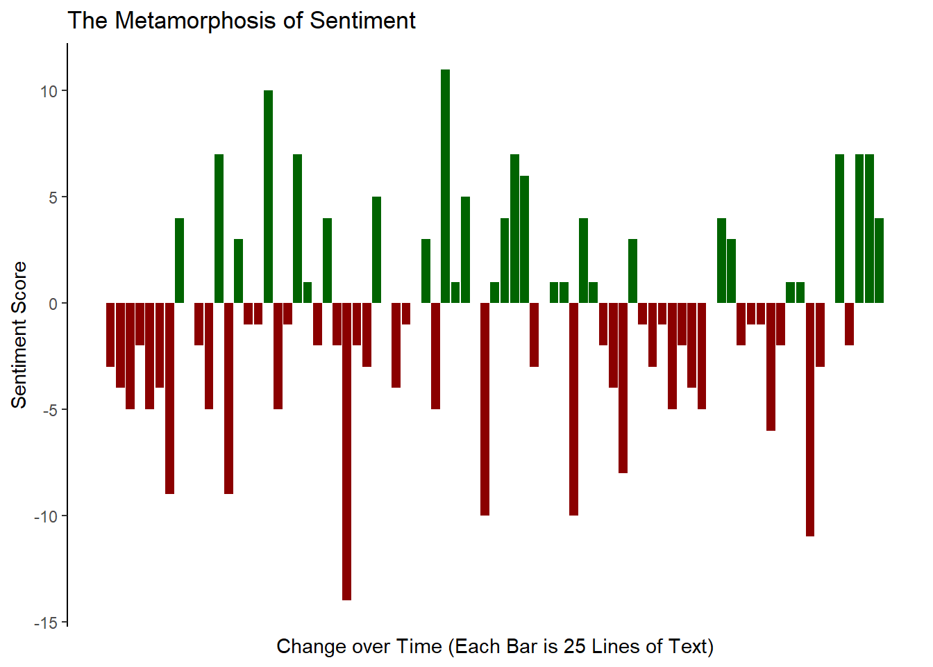 Let’s finish by returning to the “bing” lexicon and make a chart representing the change in sentiments throughout the course of Franz Kafka’s Metamorphosis. In our final visualization, we will create a bar chart where the x axis represents 25 line chunks of text, and the y axis represents the overall sentiment of that chunk.