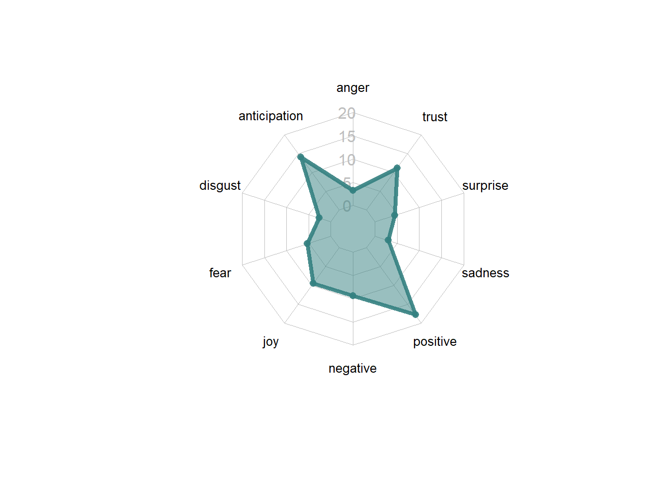 A radar chart is the perfect plot to represent the multi-polarity of the the “nrc” lexicon. The fmsb package allows us to quickly create a radar chart.